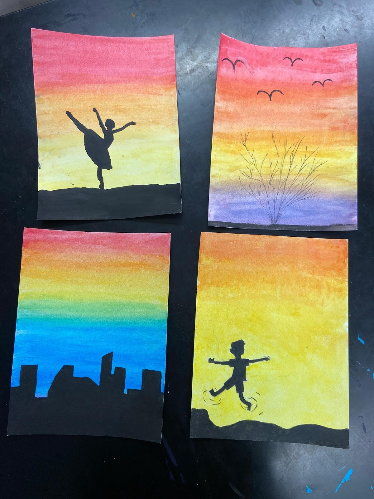 6th grade is working on Sunset Silhouettes where they use watercolor to blend together a sunset background for a silhouette of their choice!