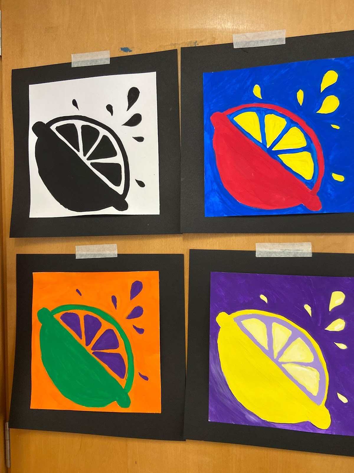 7th grade is working on Color Pop food where they create a logo for a food or drink of their choice and then paint it four different ways using color theory principals.