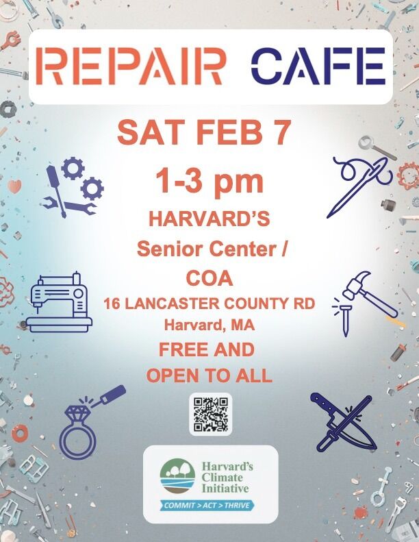 What do you do with a broken toaster, scissors that no longer cut, or a sweater with moth holes? Toss them? No way! HCIC is organizing the town’s first ever Repair Café at the Harvard Senior Center/COA, 16 Lancaster County Road, on Saturday, February 7th, from 1:00-3:00 pm.